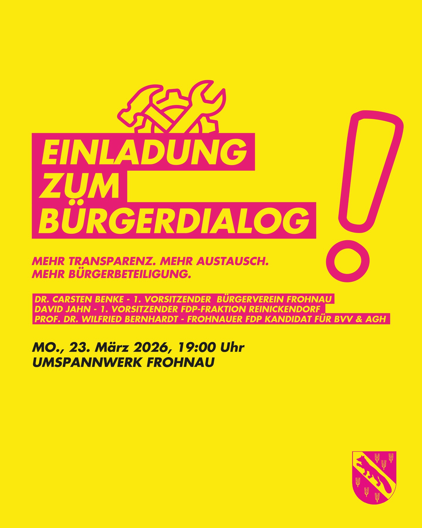 Mehr Dialog, mehr Mitsprache: Gemeinsam unseren Kiez gestalten. 🗓️Montag, 23. März 2026 🕖 19:00 Uhr 📍Transformator Frohnau, Fürstendamm 40, 13465 Berlin ☑️ Anmeldung: info@fdp-fraktion-reinickendorf.de Liebe Frohnauerinnen und Frohnauer, liebe Interessierte, In der Kiezwerkstatt Frohnau geht es um Ihre Anliegen: Welche Lösungen gibt es für die Verkehrssituation rund um den Bahnhof und die Frohnauer Brücke sowie für die Straßen wie den Edelhofdamm und den Fürstendamm? Wie können wir Frohnau wieder für den Wochenmarkt, für die Gastronomie insbesondere am Abend und die Hotellerie attraktiv machen? Wie können wir den Denkmalschutz (Casinoturm, Entenkeller) mit wirtschaftlicher und touristischer Nutzung in Einklang bringen? Und vor allem: Wie schaffen wir mehr Transparenz und bessere Kommunikation mit dem Bezirksamt, um zu vermeiden, dass Entscheidungen an den Bedürfnissen der Bürgerinnen und Bürger vorbeigehen? Als externer Gastredner wird Dr. Carsten Benke,als 1. Vorsitzender die Perspektive des Bürgervereins Frohnau einbringen und mit David Jahn, FDP-Fraktionsvorsitzender in der BVV Reinickendorf und Ihnen diskutieren. Moderiert wird die Diskussion von dem FDP-Kandidaten für BVV& AGH in Frohnau, Prof. Dr. Wilfried Bernhardt. Wir freuen uns über Ihre Teilnahme! Ihre FDP-Fraktion in der BVV Reinickendorf